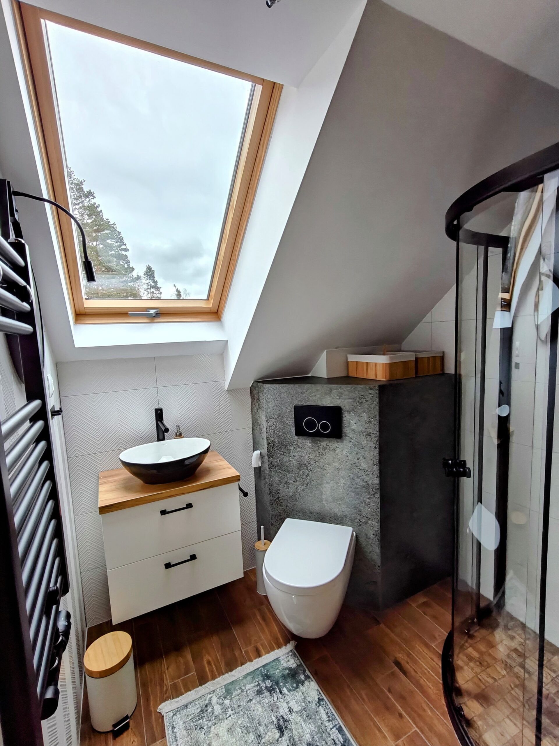 - Łazienka: prysznic, WC, umywalka, ręczniki i podstawowe kosmetyki