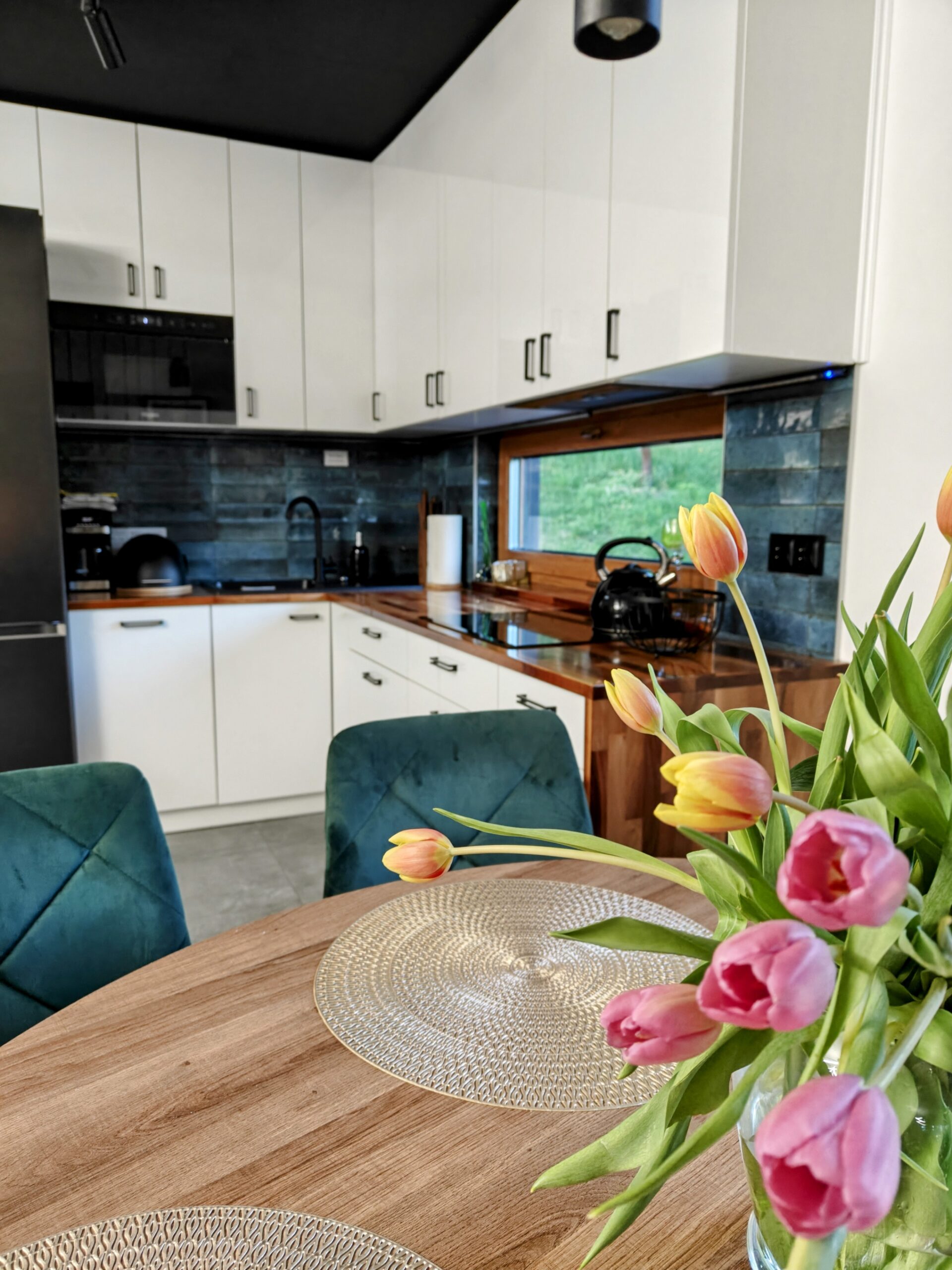 - W pełni wyposażona: płyta indukcyjna, lodówka, ekspres do kawy, blender, toster i wiele innych